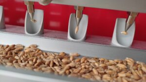 Посев осуществляется планкой с форсунками, которые всасывают семена и аккуратно и равномерно укладывают их в ячейки ряд за рядом. Также делается отверстие, в которое будет аккуратно вложена семечка.