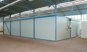 - Внешнее покрытие стены периметра и разделительные стены с готовыми многослойными панелями из оцинкованных листов, предварительно покрытые внутри самозатухающим полиуретаном.