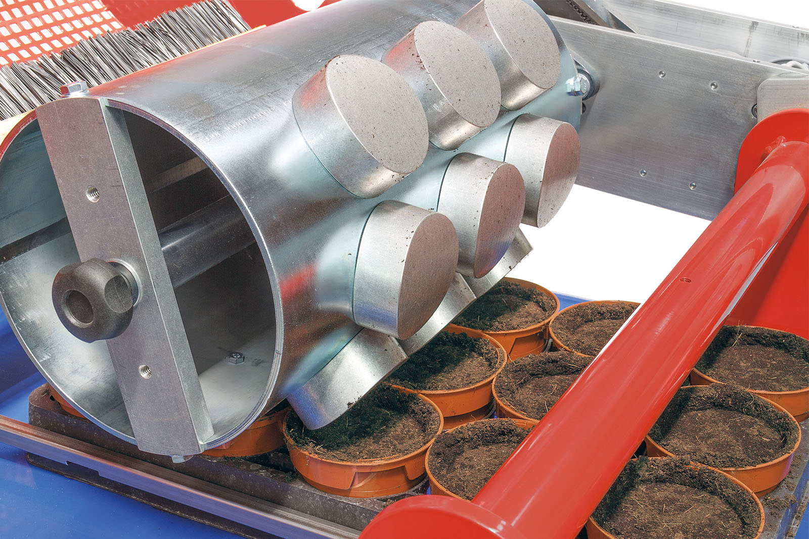 В линейке нового поколения поддоны двигаются по наполнительному конвейеру один за другим, что позволяет достигать максимальной однородности заполнения каждой палетки, включая те, которые находятся с краю. Имеется возможность откорректировать количество грунта с тем, чтобы получить на выходе заполнение низкой, средней или высокой плотности. Палетки прекрасно очищаются от излишней почвы, которая полностью перерабатывается. Формирователь лунок обеспечивает отцентрированное расположение палетки и абсолютно правильную форму отверстия. Все корректировки и настройки осуществляются при помощи удобной ручки. Низкий уровень шума обеспечивает удобство при работе оператора.