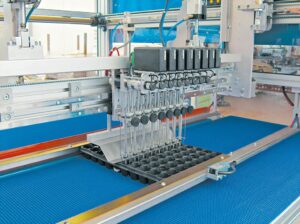 Беспроводная пикировочная машина с функцией посадки в несколько кассет идущих друг за другом и возможностью использовать до 26 пальцев-захватов для пикировки на максимальной ширине 1500 мм.