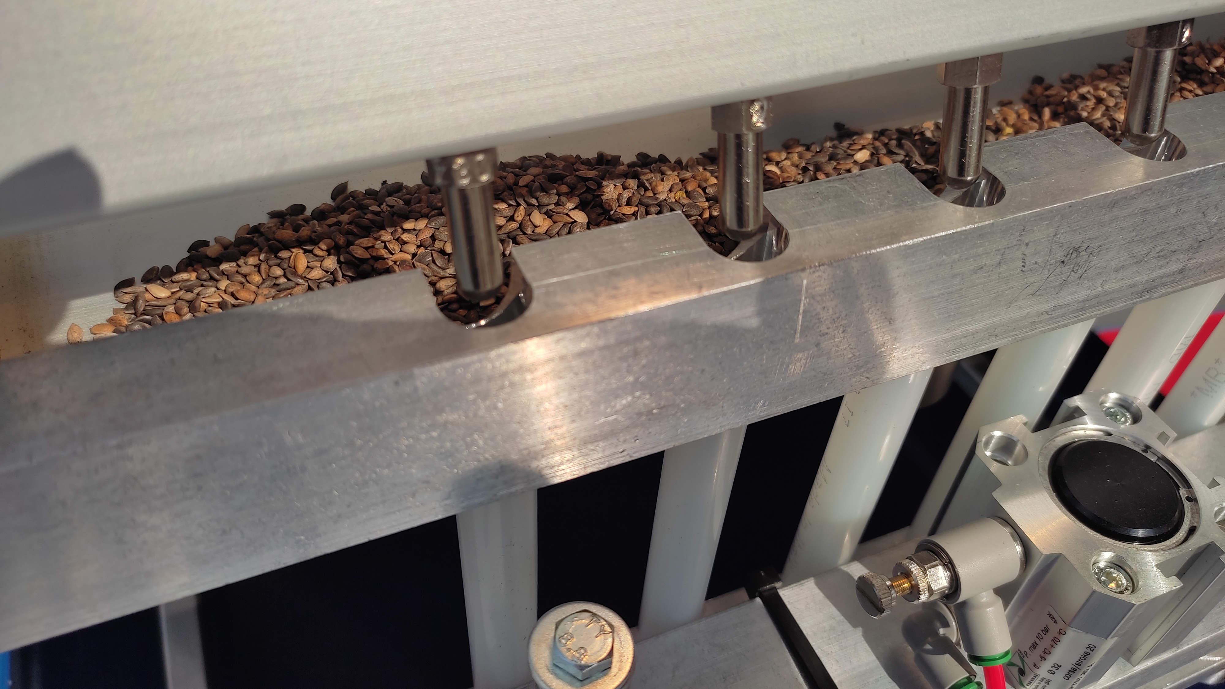 Высевающий механизм сеялки SEMKAPPA65 приводится в действие штангой с форсунками, которые всасывают семена и укладывают их точно и равномерно в ячейки ряд за рядом. В этом же процессе также делается отверстие, в которое семечка помещается на нужную глубину в центр ячейки.