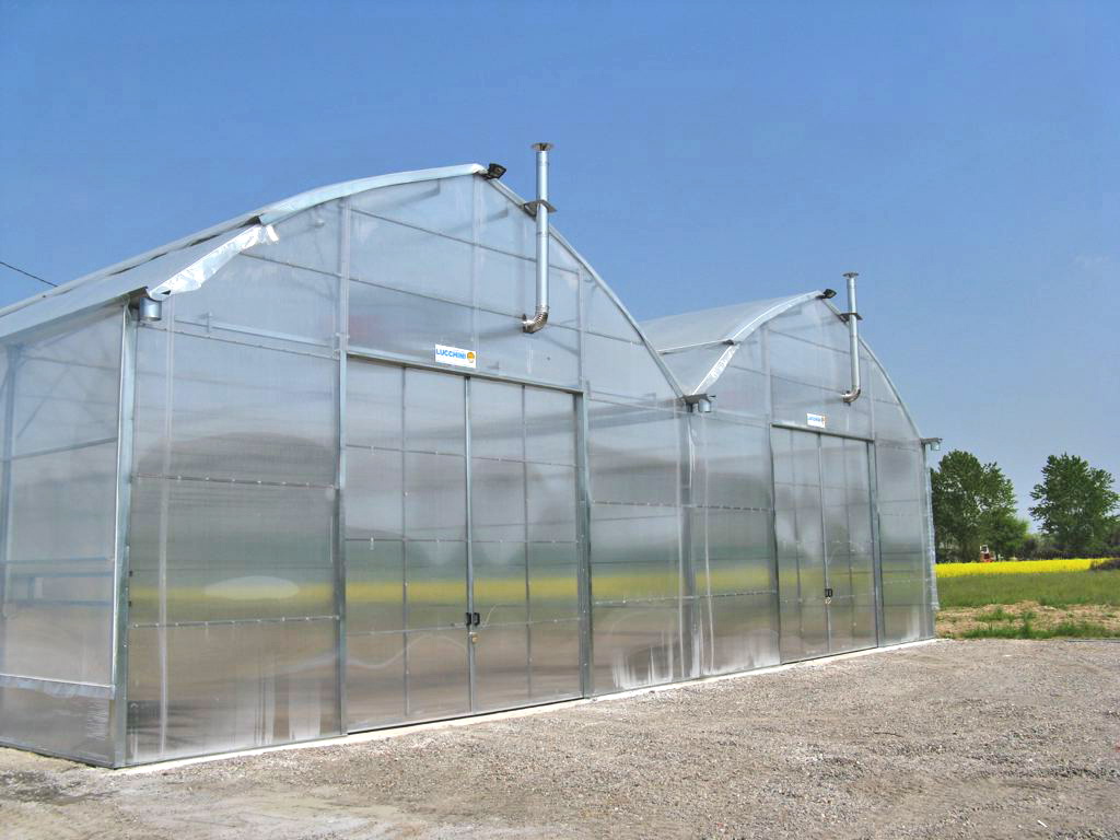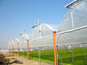 Боковые окна из волнистого стеклопластика с зубчатыми рейками или же из поликарбоната с открытиями “гильотина”, с автоматическим управлением через электрический щит. Верхние окна из простой плёнки или двойной надутой, с автоматическими открытиями.